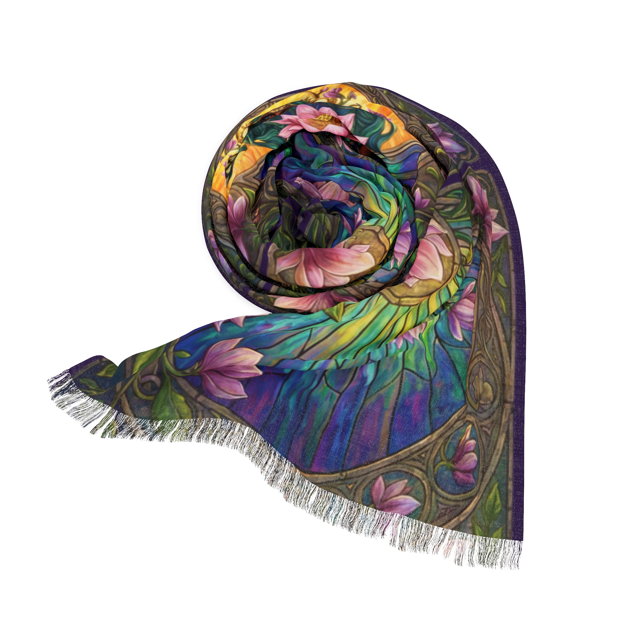 Each scarf carries an Earthwitch Goddess in richly detailed art nouveau illustration - jewel tones, botanical linework, and earth-magic symbolism printed on soft, lightweight fabric that moves with you. Wear it as a wrap on cool mornings, a drape at outdoor gatherings, or a delicate accent over a simple dress. Fold it into a bag and carry a little magic wherever you go. Lay it flat and it becomes something else entirely - an altar cloth, a tarot spread, a surface worth pausing over.