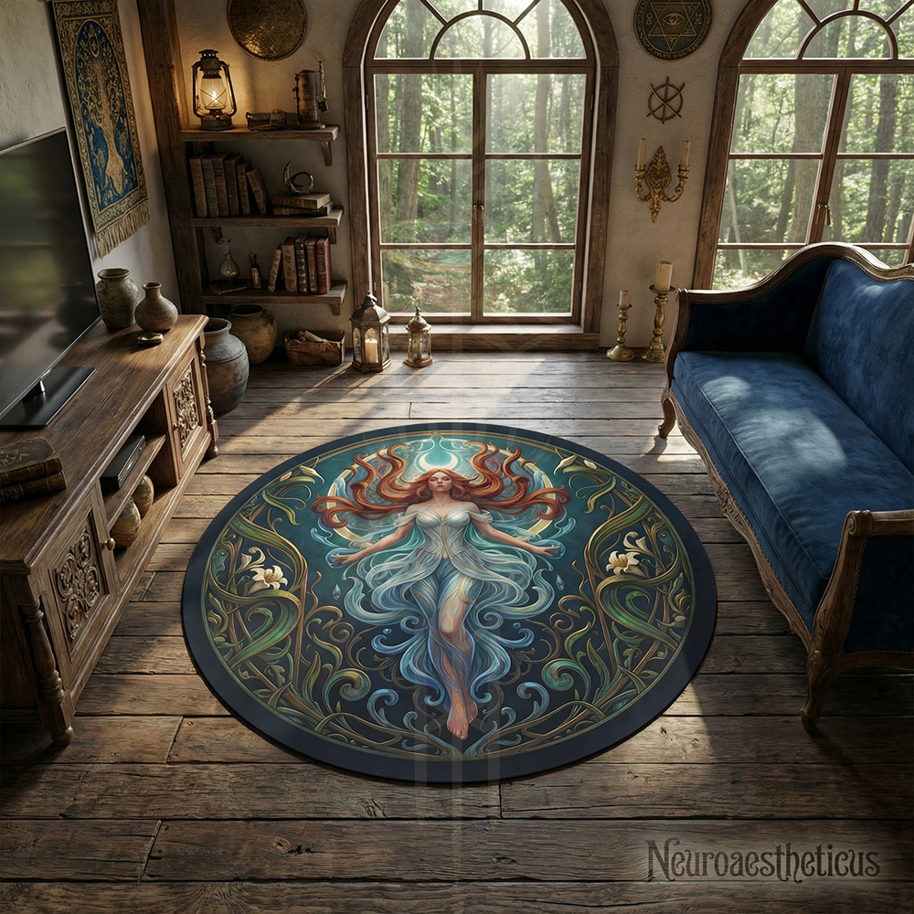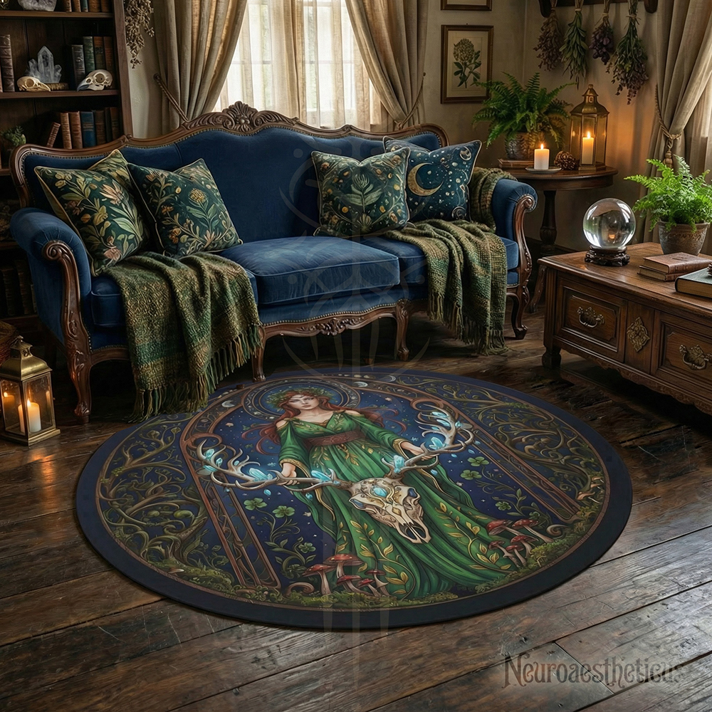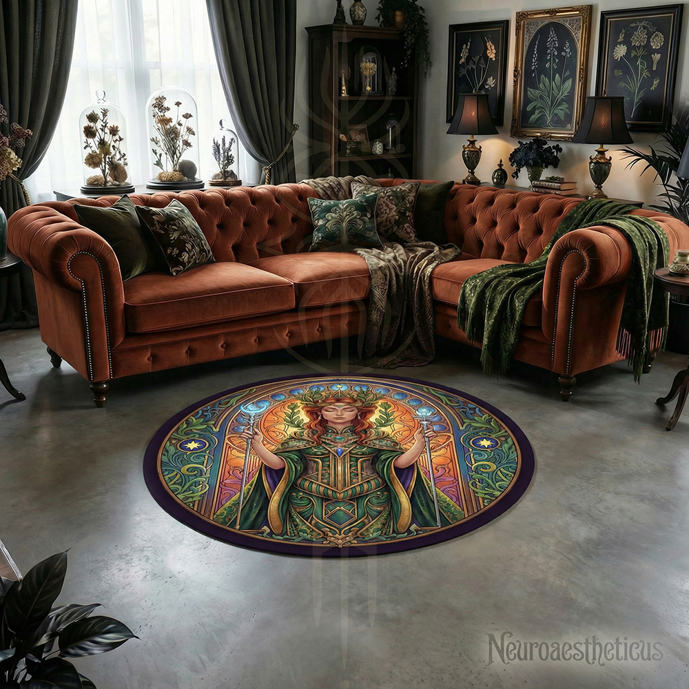 Each rug carries an Earthwitch Goddess in rich jewel tones and intricate art nouveau detail — the kind of image that rewards a slow look and becomes part of a room's story. At 60" across, it's generous enough to anchor a reading corner, a meditation space, or a low table gathering. Soft plush chenille invites bare feet and unhurried mornings. The colours hold like a memory you return to each season.