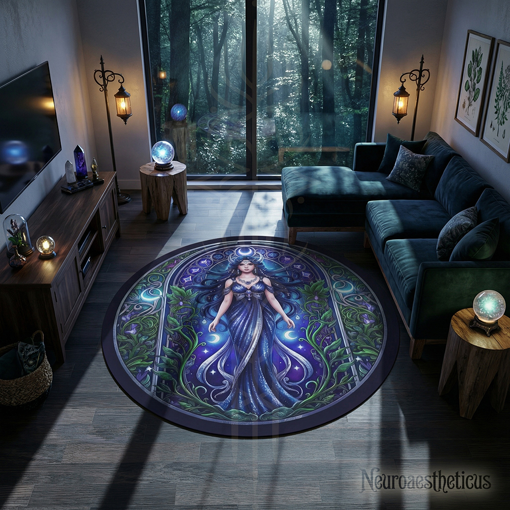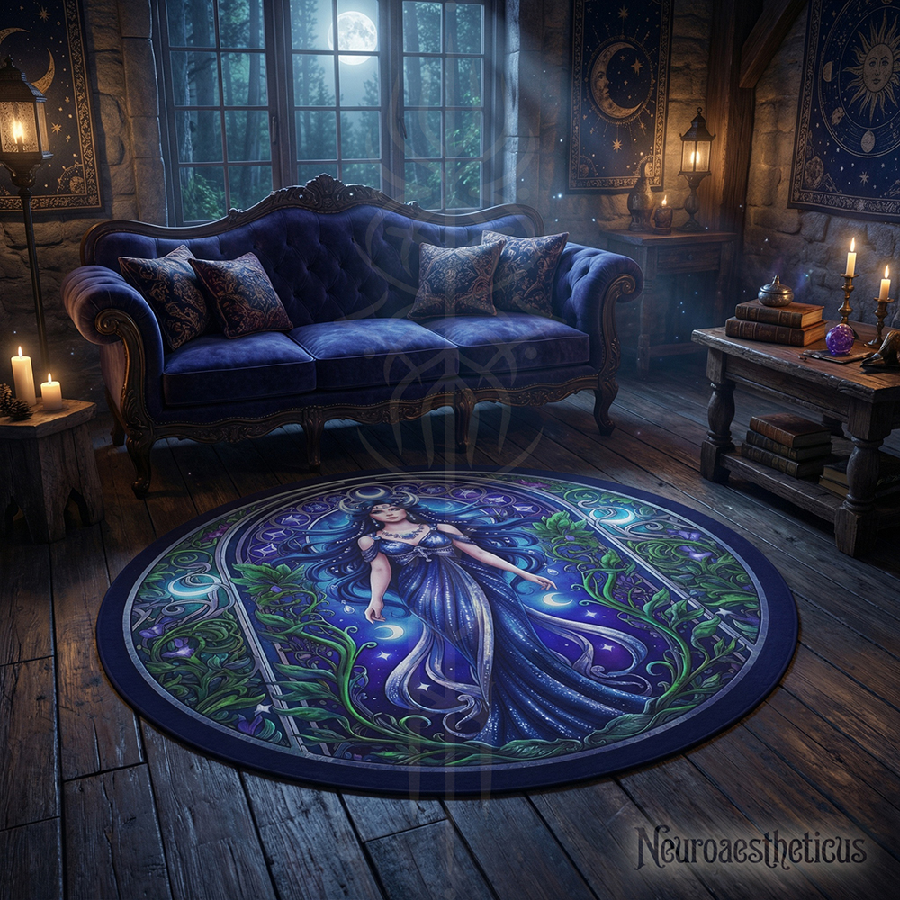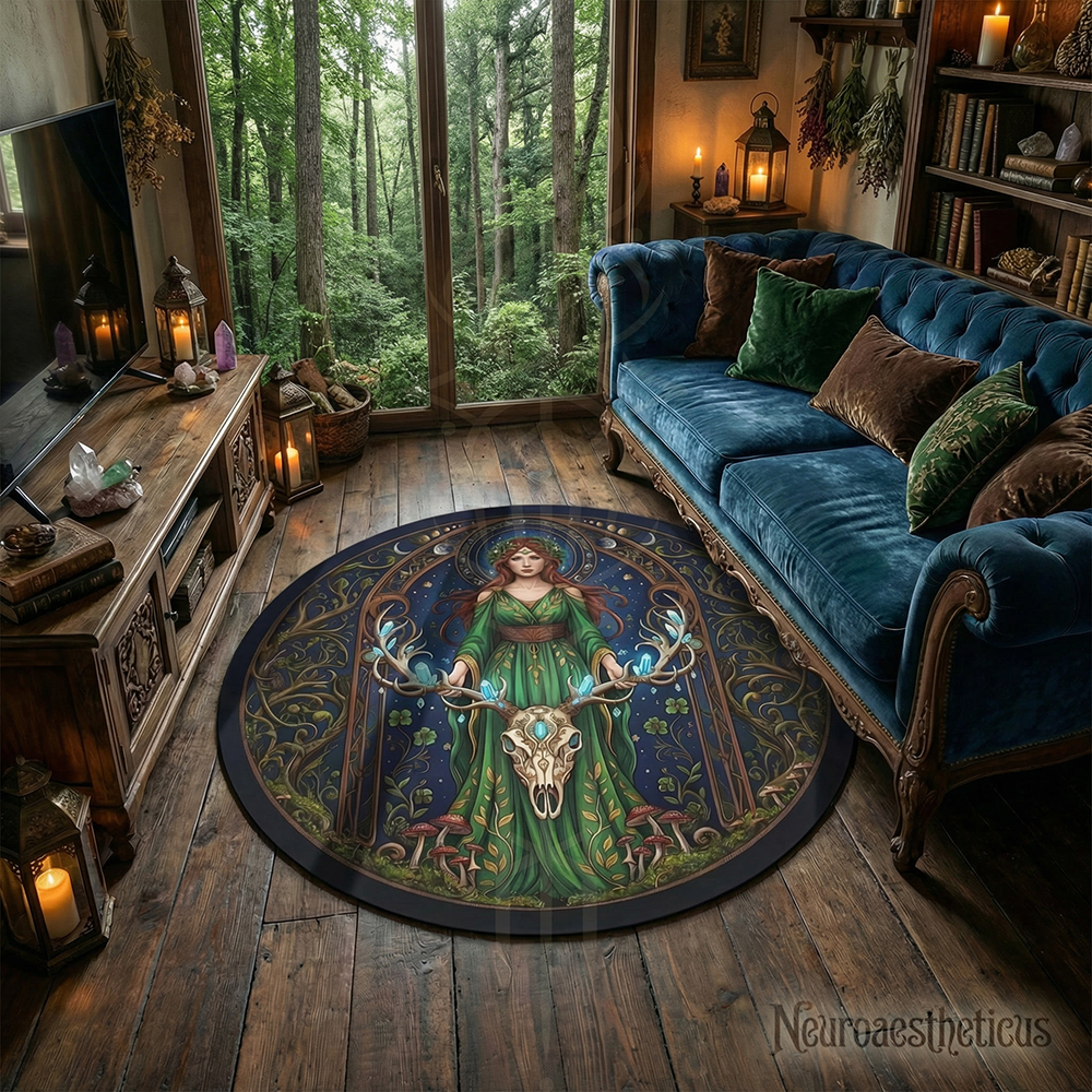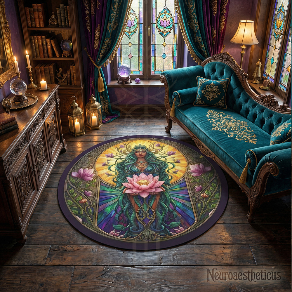 Each rug carries an Earthwitch Goddess in rich jewel tones and intricate art nouveau detail — the kind of image that rewards a slow look and becomes part of a room's story. At 60" across, it's generous enough to anchor a reading corner, a meditation space, or a low table gathering. Soft plush chenille invites bare feet and unhurried mornings. The colours hold like a memory you return to each season.