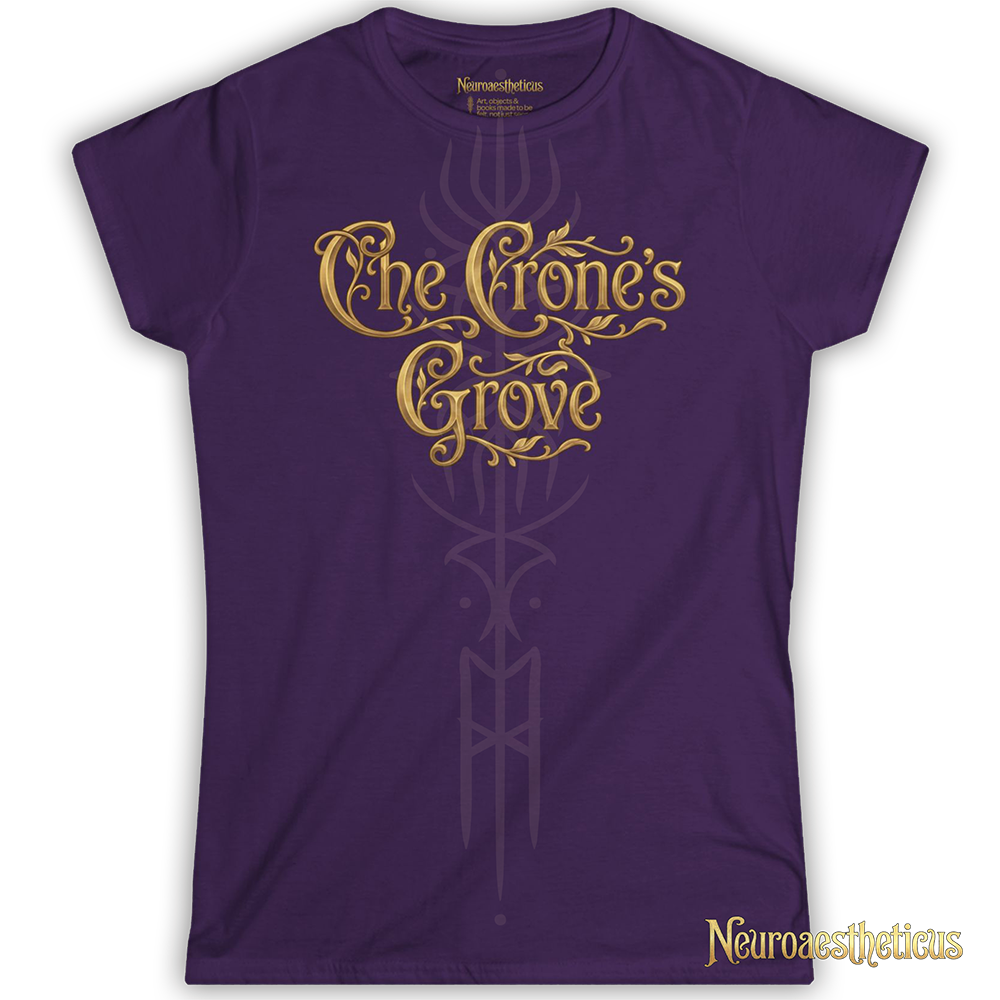 The front bears an ornate, slightly weathered script: The Crone's Grove. The back carries the mantra you already live by: Gathered. Known. Seen. Warm antiqued lettering in the same steady tone - front and back reading as one quiet statement about where you belong and who you've become.